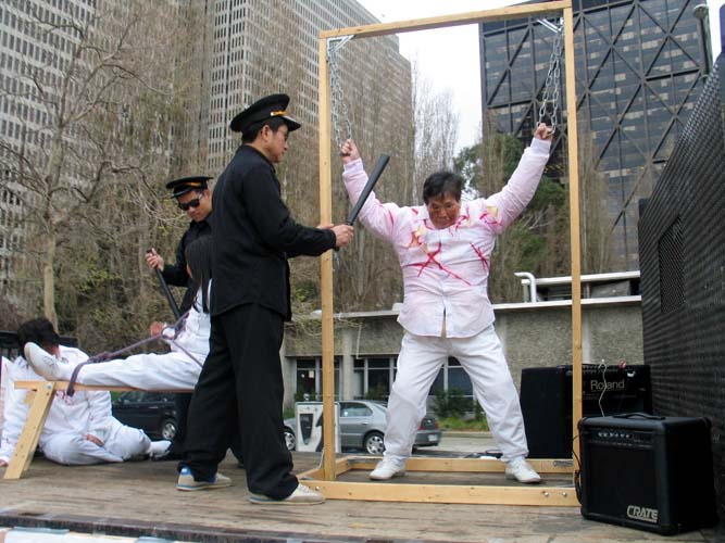 世界各国学员举行旧金山正法之路大游行 图为游行中真人酷刑演示