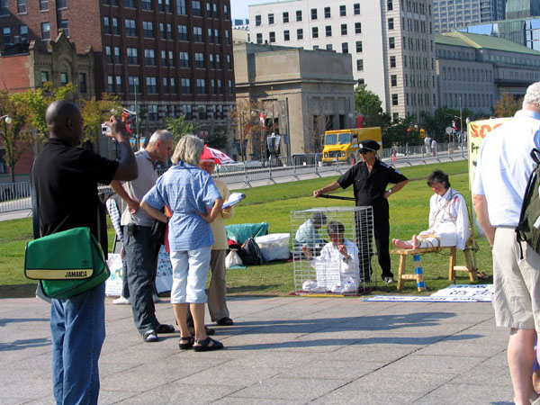 温家宝访法前夕 法轮功学员举办模拟酷刑揭露发生在中国的对法轮功修炼者的迫害 2005-12