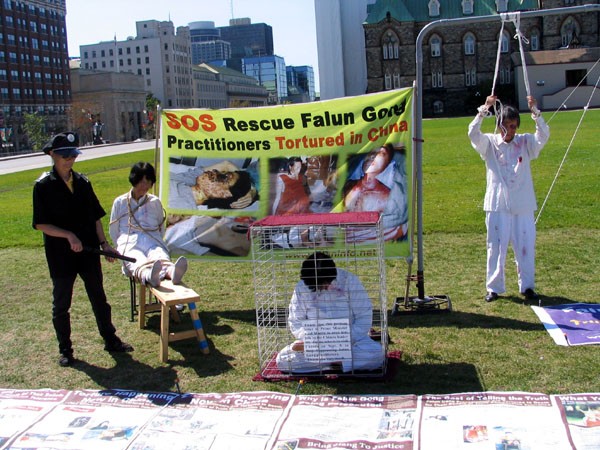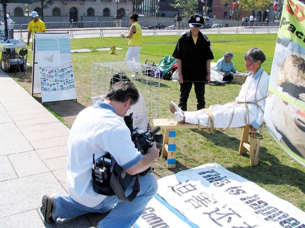 胡锦涛来访前 加拿大法轮功学员国会山前举办反酷刑展 重现中共对在中国的法轮功学员身上使用的酷刑