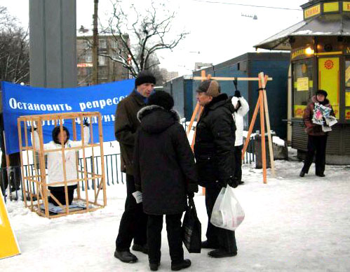 俄罗斯莫斯科法轮功学员在莫斯科州艺术馆前的广场举办反酷刑展,揭露迫害