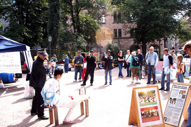 欧洲法轮功学员在芬兰举办酷刑演示,向民众介绍法轮功及中共对法轮功的残酷迫害真相