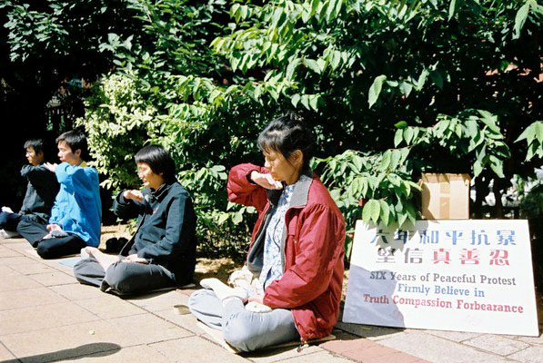 法轮功学员在伦敦唐人街举办讲真相反迫害活动图为祥和的功法演示2008-7-19