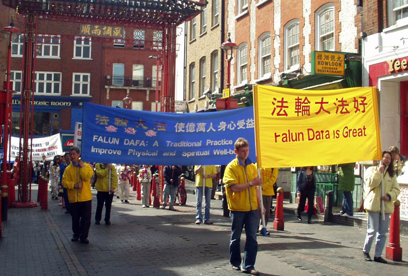 “4.25”七周年前夕 伦敦法轮功学员游行集会抗议中共迫害 图为游行队伍经过中国城2006-4-22