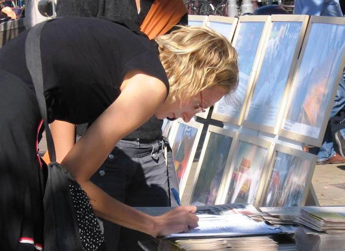 很多荷兰市民和其他国家的游客在制止活摘器官的征签表上签名