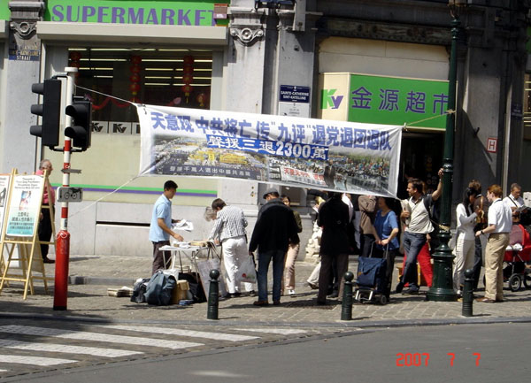 法轮功学员在比利时布鲁塞尔中国城揭露中共残酷迫害并声援三退2007-7-7