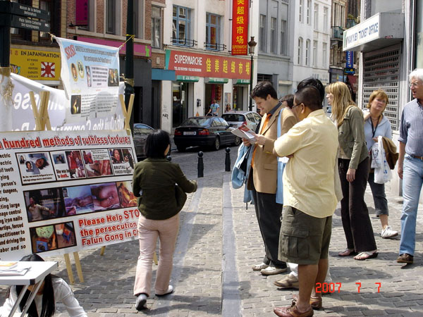 法轮功学员在比利时布鲁塞尔中国城揭露中共残酷迫害及声援三退2007-7-7