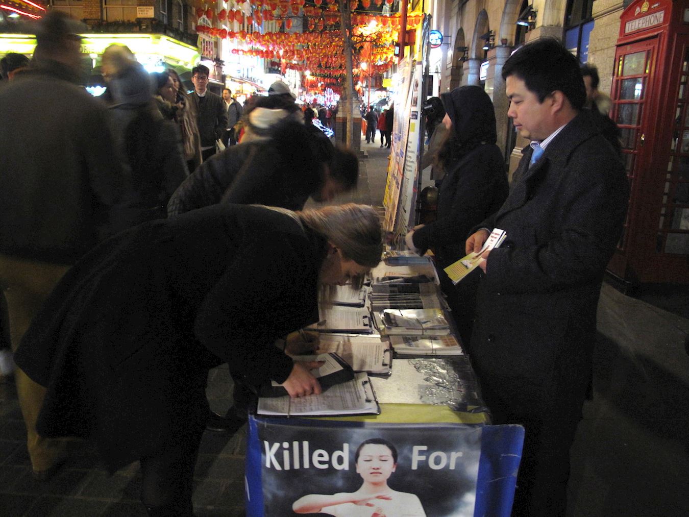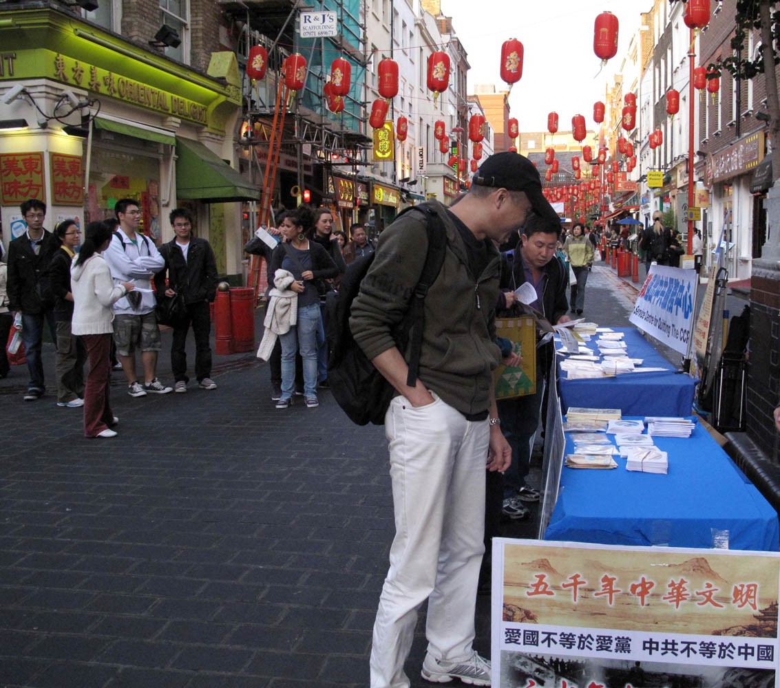 法轮功学员在伦敦唐人街设立真相点,传播真相,民众签名制止迫害。