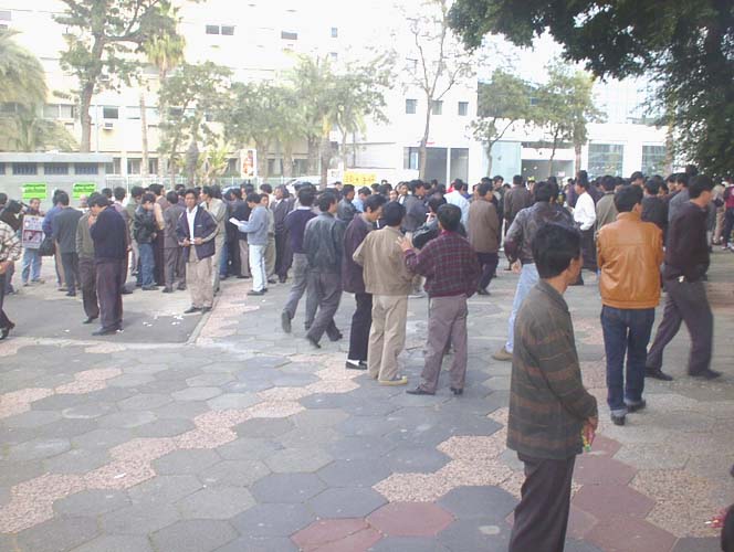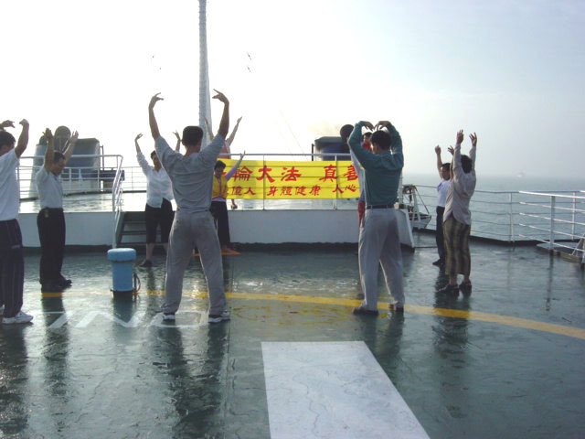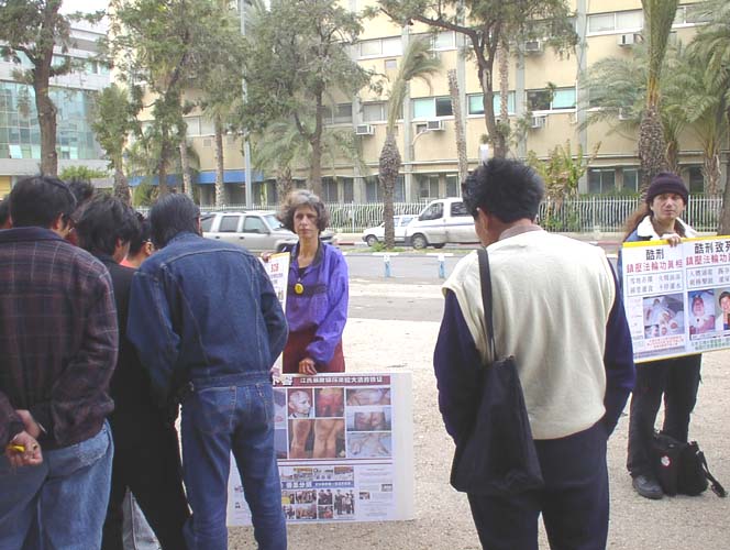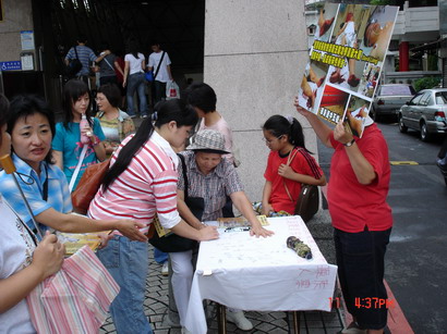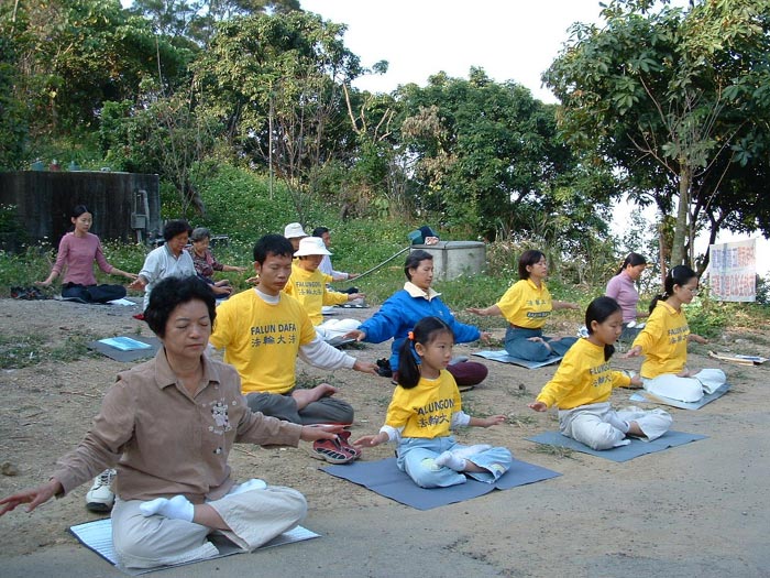 在台湾高雄县永安乡的石斑鱼文化节上 学员们集体练功并向当地群众讲清真相