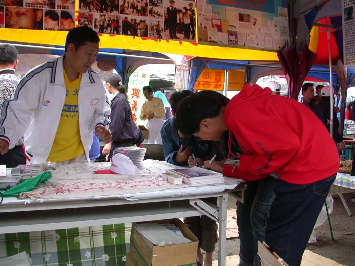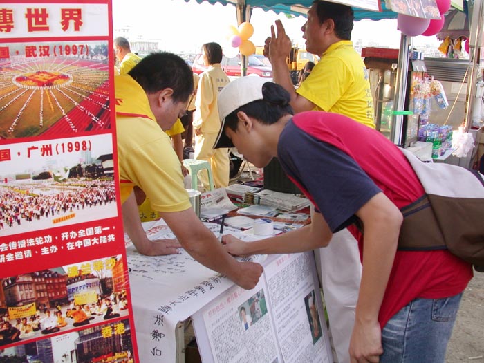 法轮功学员参加台南嘉年华会 向逛园游会的民众们介绍法轮功以及中国大陆江氏集团迫害法轮功的真相
