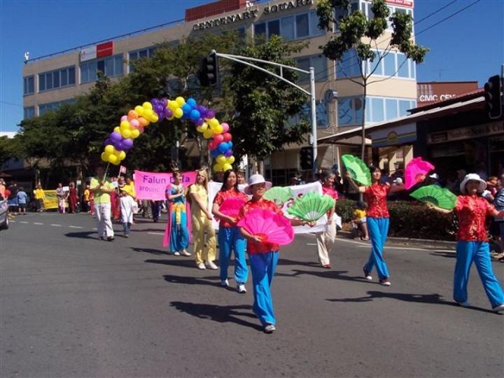 澳洲维娃-拉-恭节上 法轮功学员以“和平的花瓣”为主题参与庆祝活动向游客洪法和讲清真相