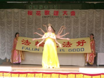 日本法轮功学员参加爱知县丰田市水源樱花节,图为学员表演舞蹈“金光千手佛” 2008-4-12至13