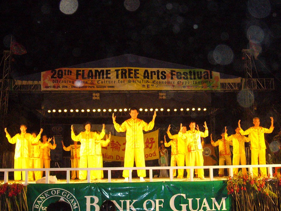 法轮功学员在塞班岛火树节传播大法的美好图为功法演示