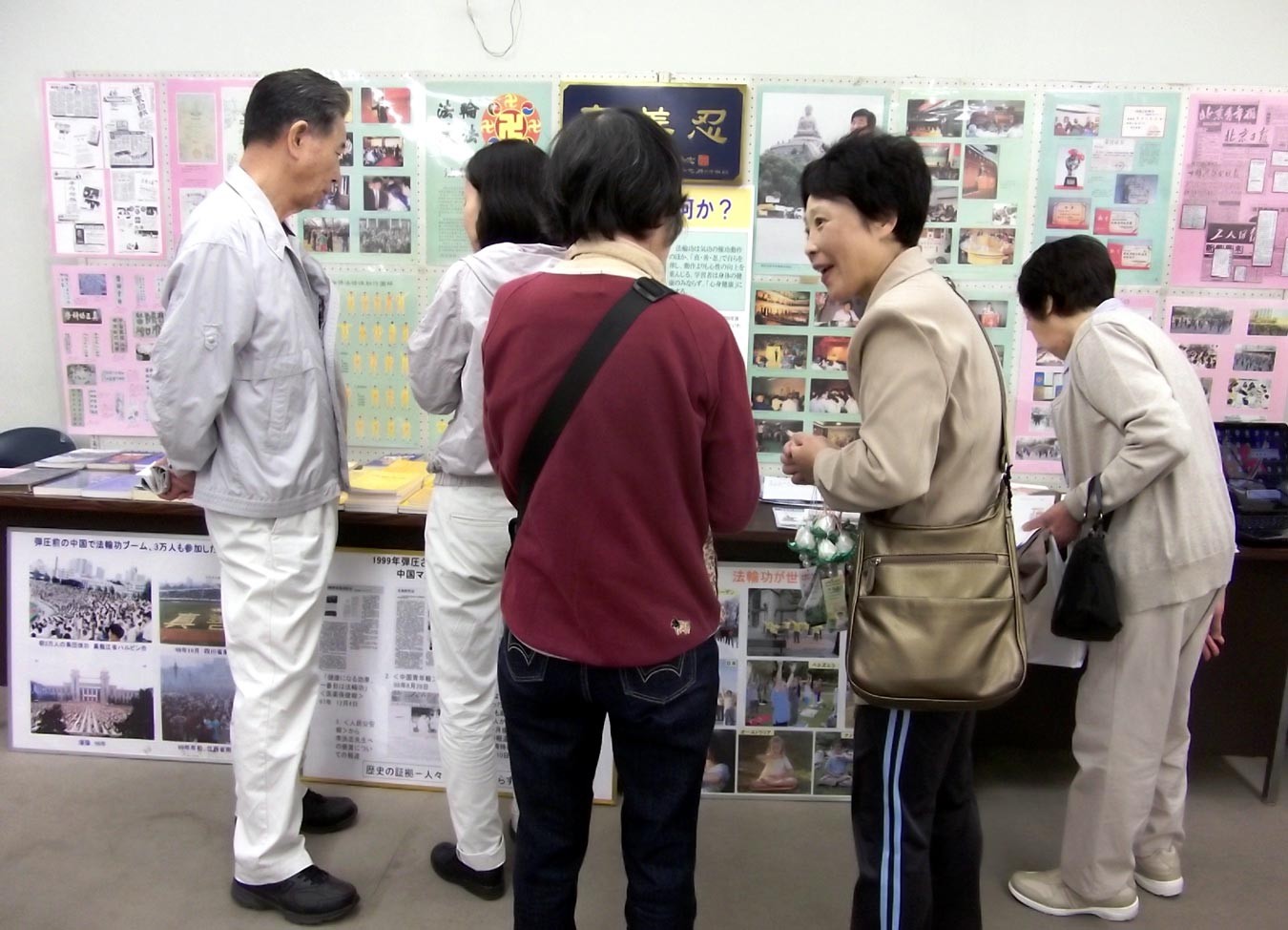 学员在长野县文化节上介绍法轮功的美好,展位上炼功