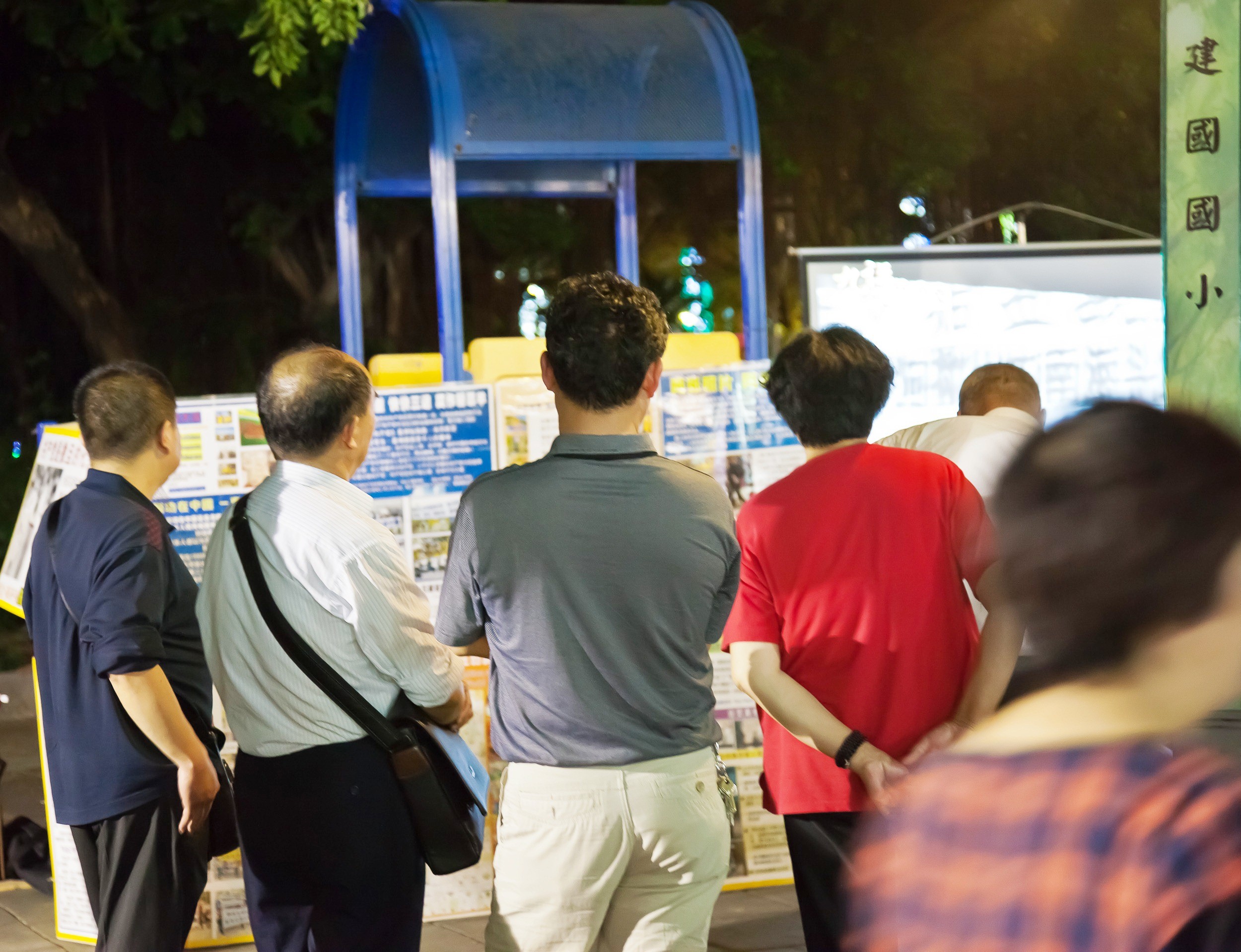 六合夜市讲真相,数年如一日图为真相展板,大陆游客争相观看