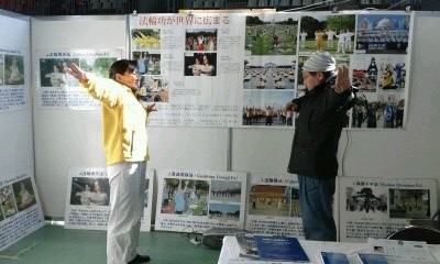 法轮功学员参加名古屋大学举办的自由市场活动图为在展位上演示美好祥和的功法