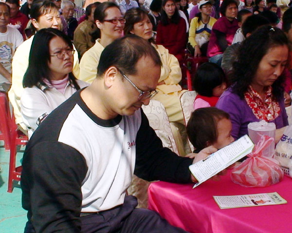 法轮功学员应邀参加路竹乡番茄文化节图为民众接到真相资料后聚精会神的阅读2008-12-27至28