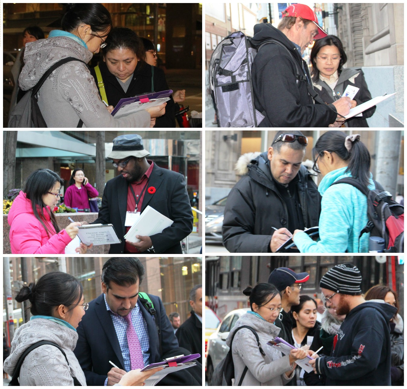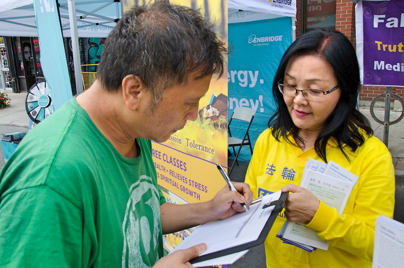 法轮功学员应邀参加多伦多韩裔丰收节庆祝活动,民众在明信片 签名邮寄给总理
