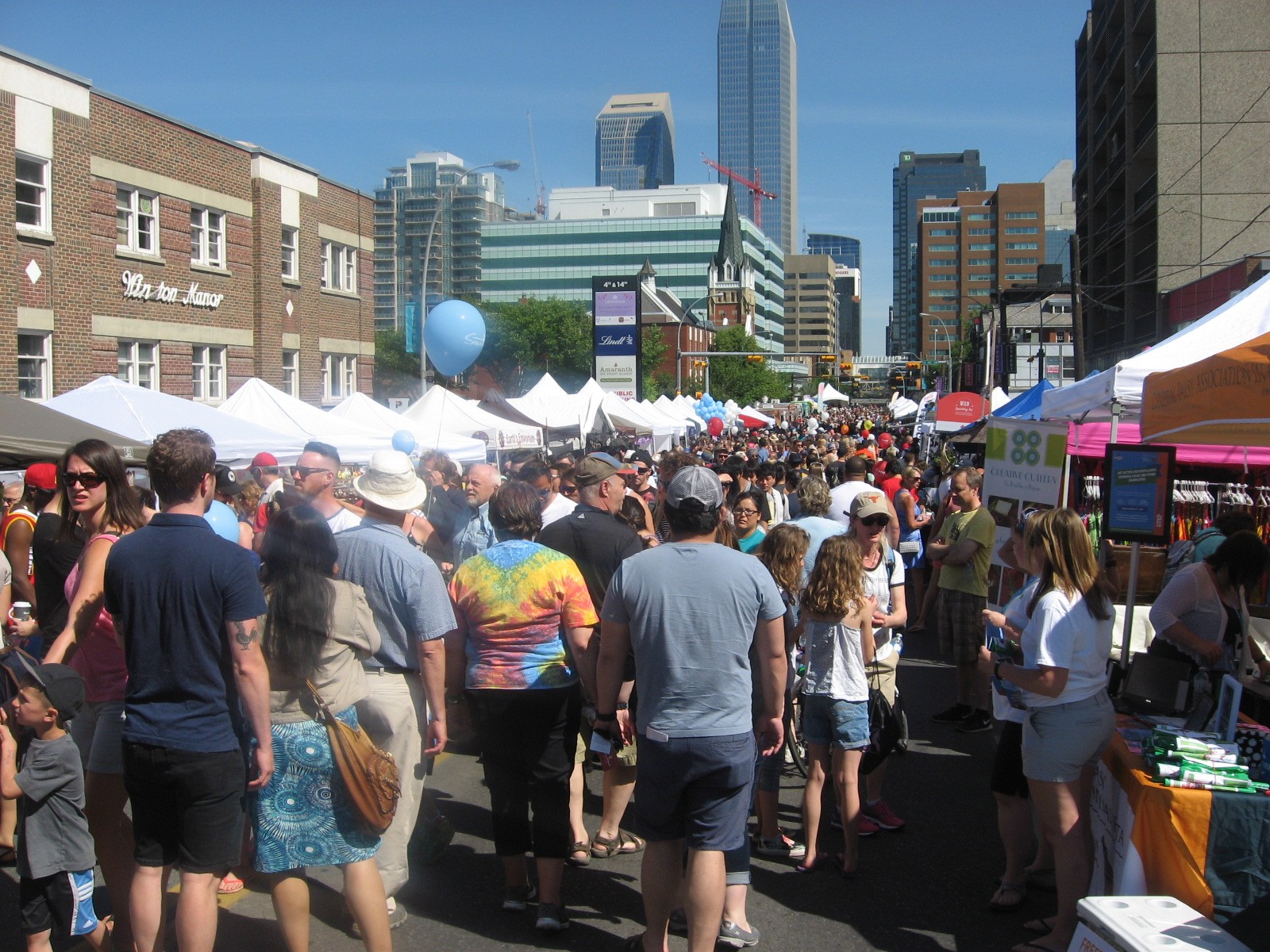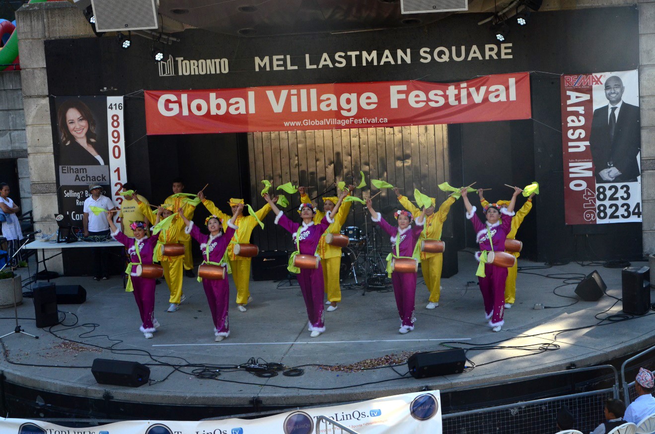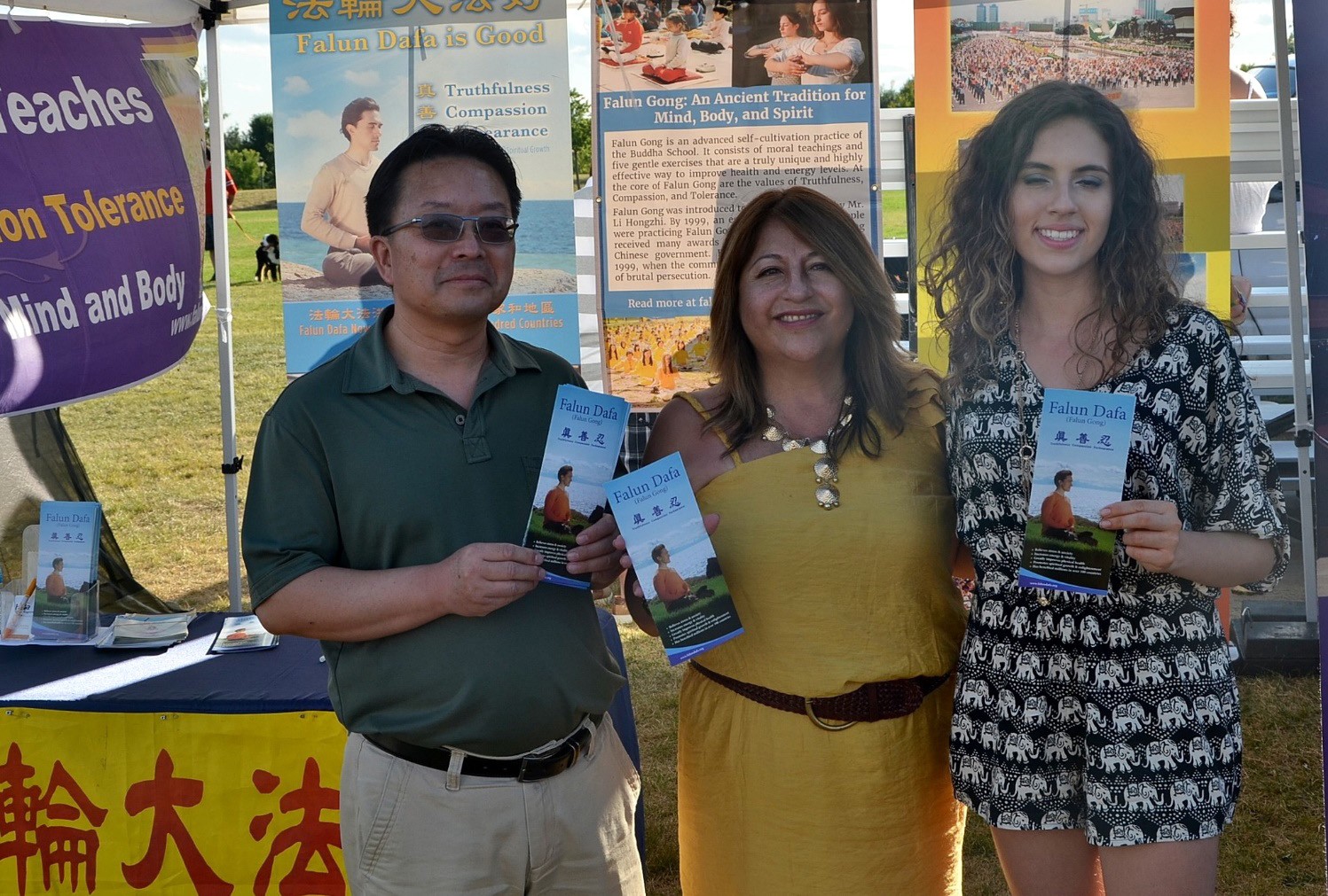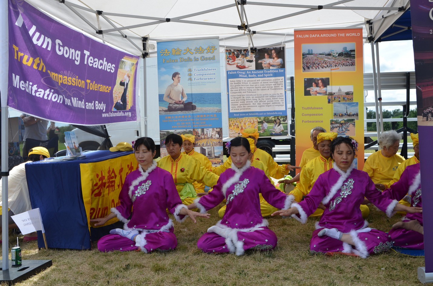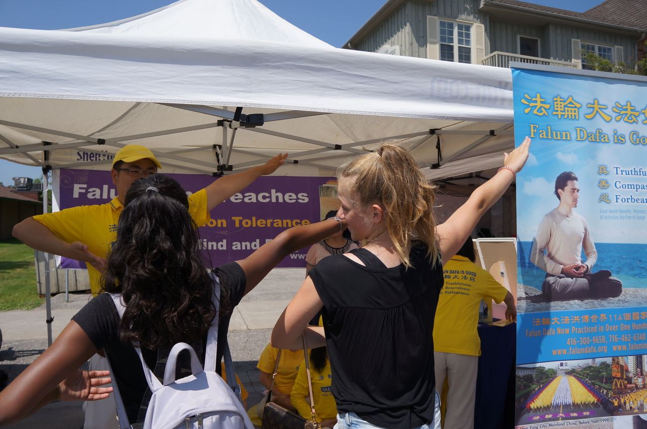法轮功学员应邀参加多伦多国际村节,设立展位,向人们介绍法轮大法并演示五套功法,