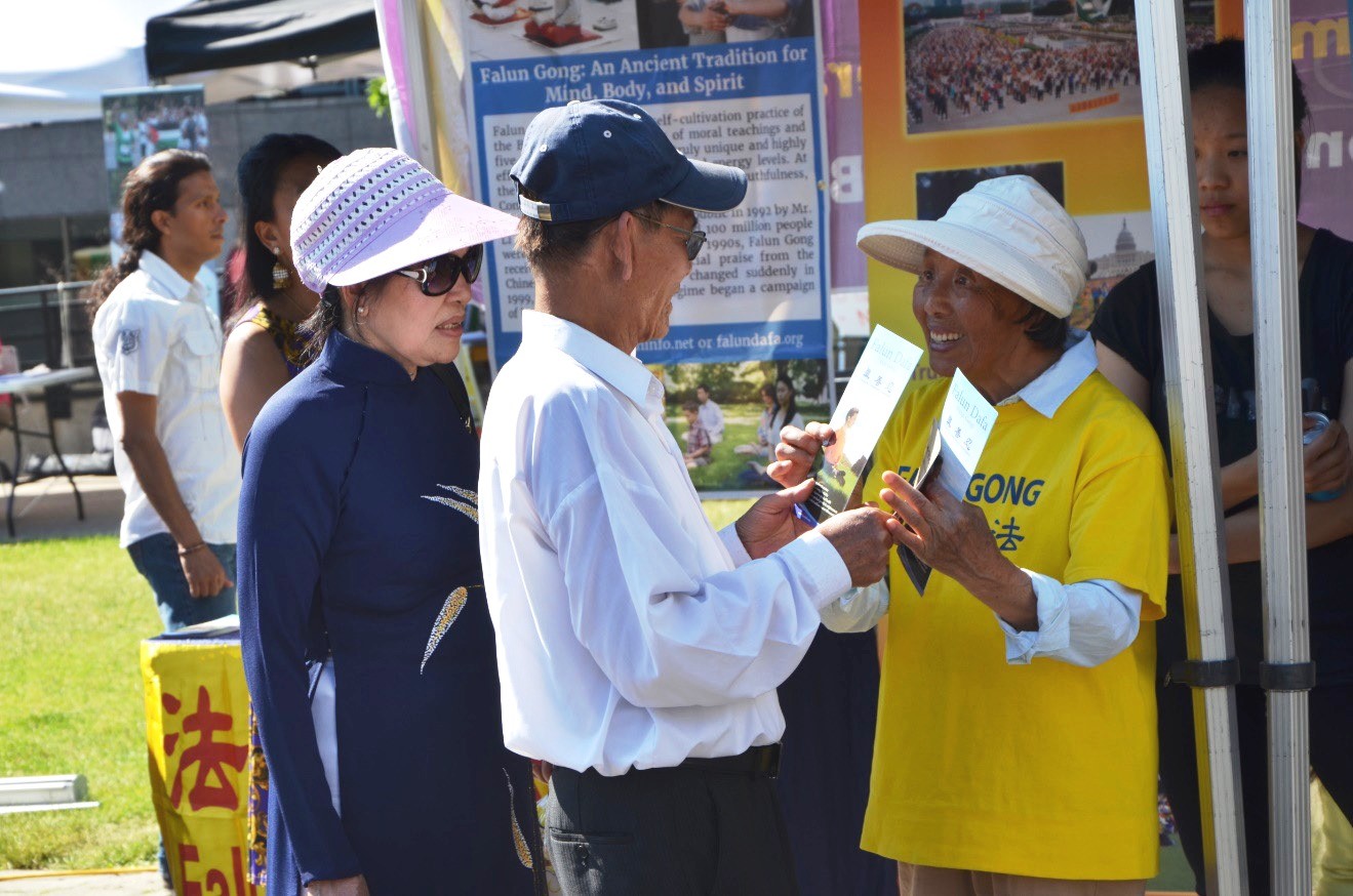 法轮功学员应邀参加社区活动 展位上很多游客了解真相,签名支持反迫害