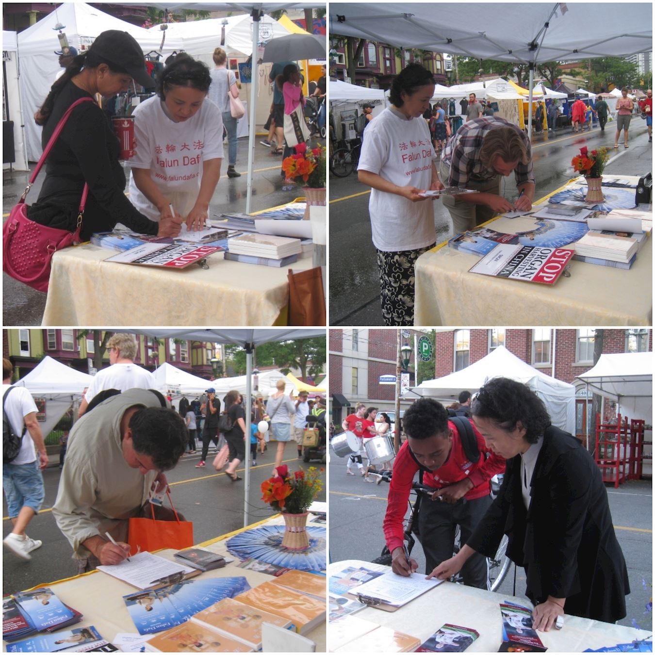 法轮功学员参加健康节,民众对中共的暴行感到愤慨,并在反迫害征签表上签名。