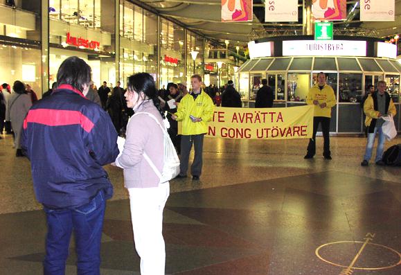 瑞典法轮功学员在哥德堡市中心最繁华的商业中心,向瑞典人民揭露江政府的罪恶行径