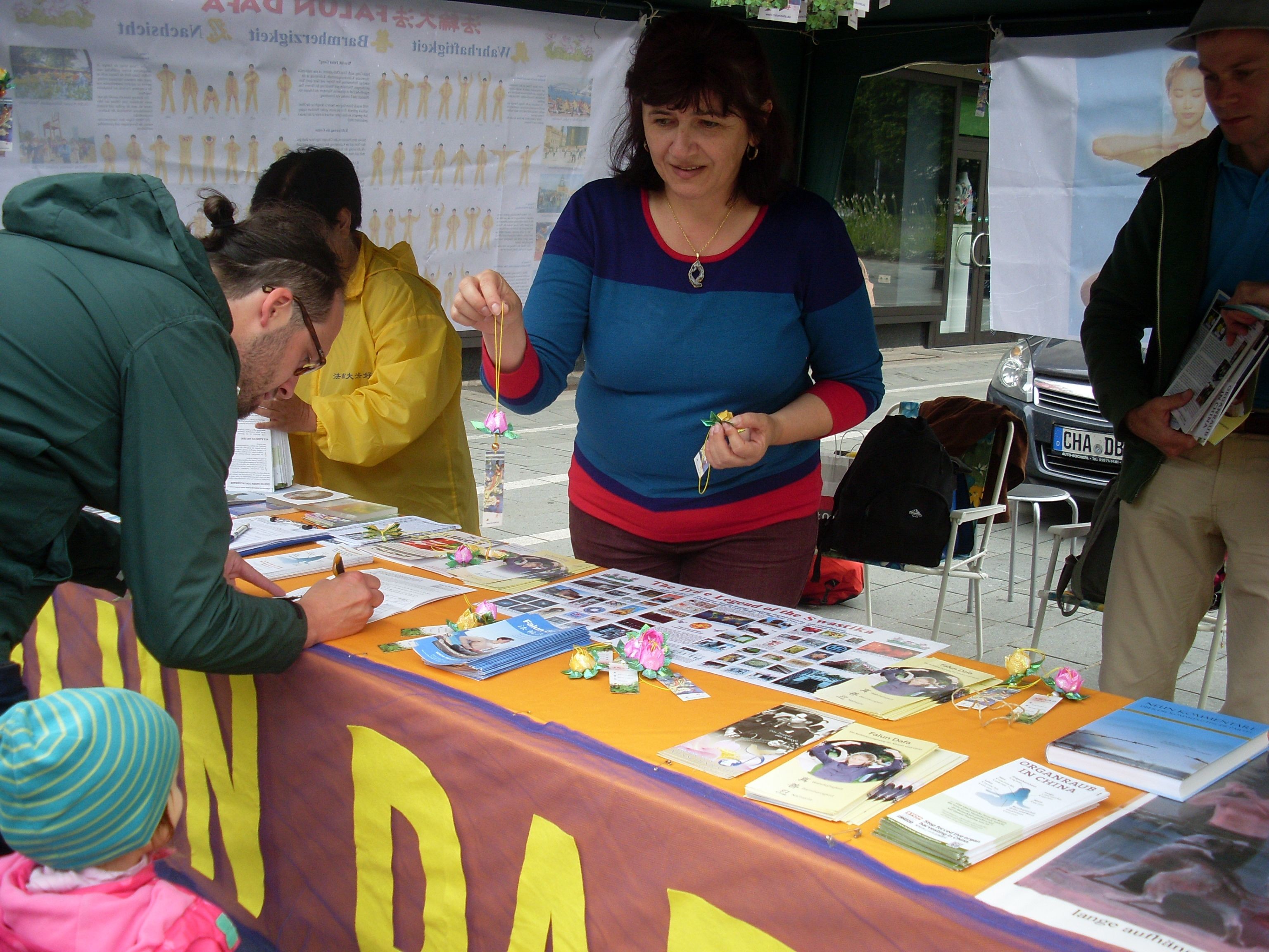 法轮功学员在弗莱堡市举办征签活动,民众签名反中共强摘器官