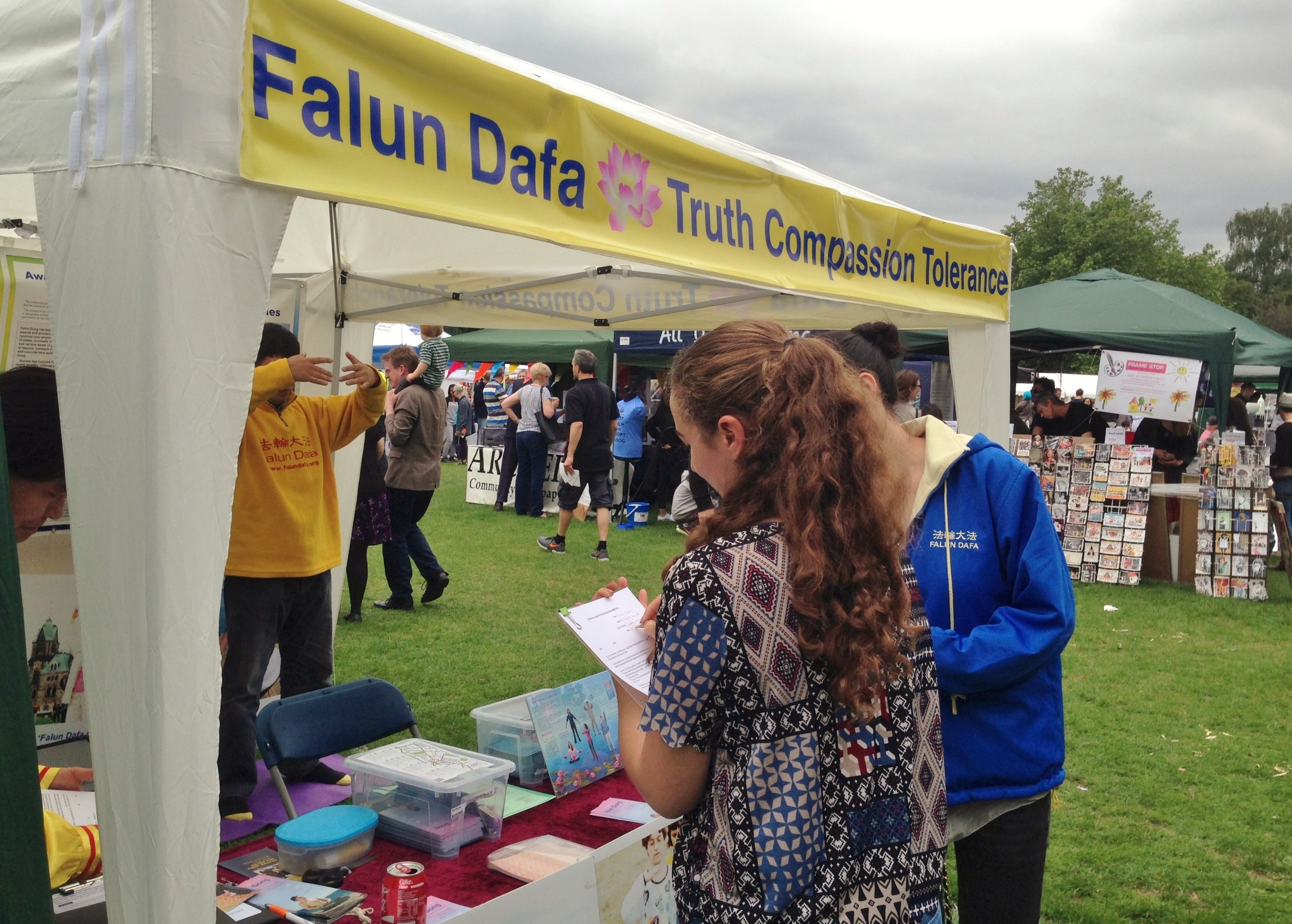 人们纷纷来到签名台并在DAFOH请愿书上签名支持法轮功学员