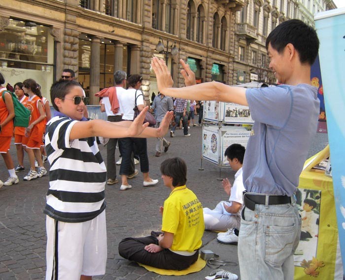 法轮功学员在米兰运动日传播大法并摆放揭露酷刑的展板
