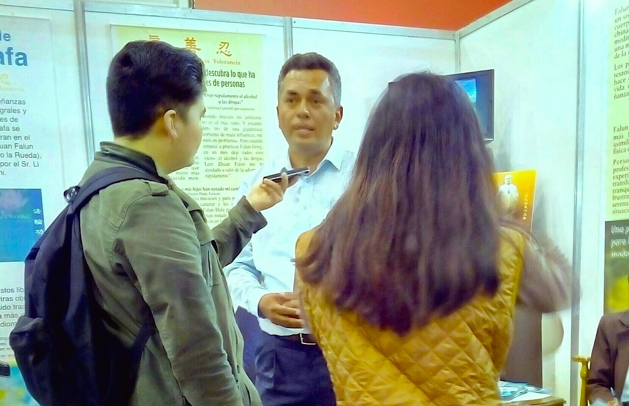 法轮功学员参加厄瓜多尔国际书展,络绎不绝的人群学炼功法