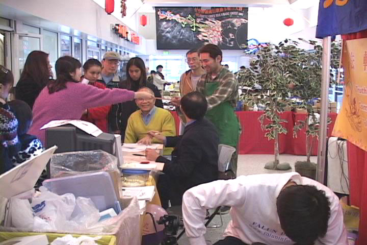 明州法轮功学员在双城庆祝法轮大法周及世界法轮大法日--亚洲节展位前教功