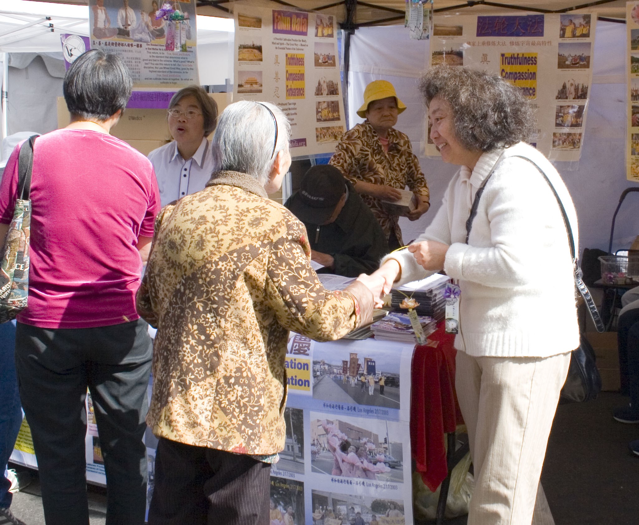 法轮功学员在集市上设立摊位,传播大法真相