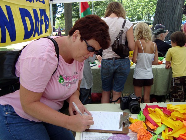 法轮功学员参加美国波士顿中国城中秋节庆图为民众在制止中共活摘器官征签表上签名2008-8-17