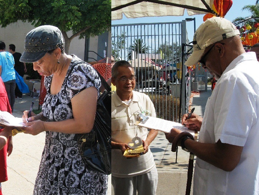 法轮功学员在秋季庆祝活动征签,民众签名反活摘