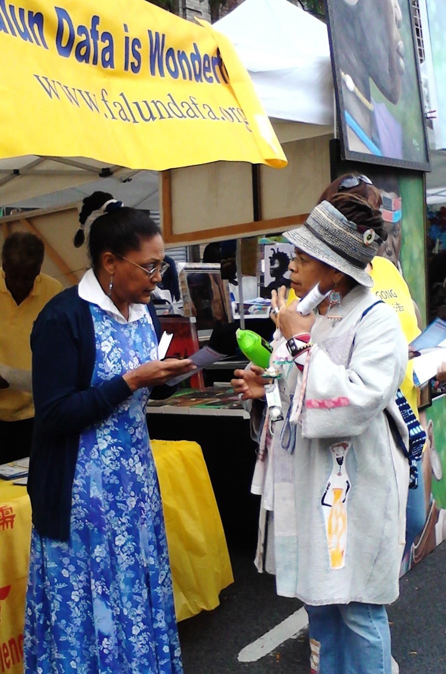 法轮功学员在曼哈顿的集市上摆设展位,传播真相