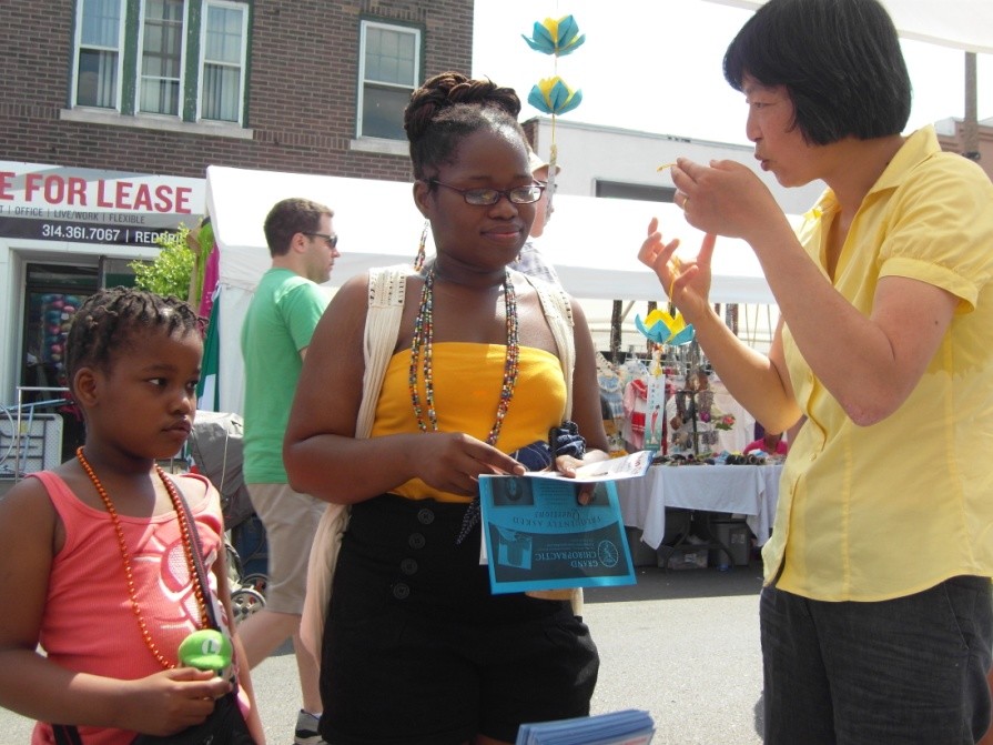 法轮功学员参加圣路易地球日活动,向人们介绍功法