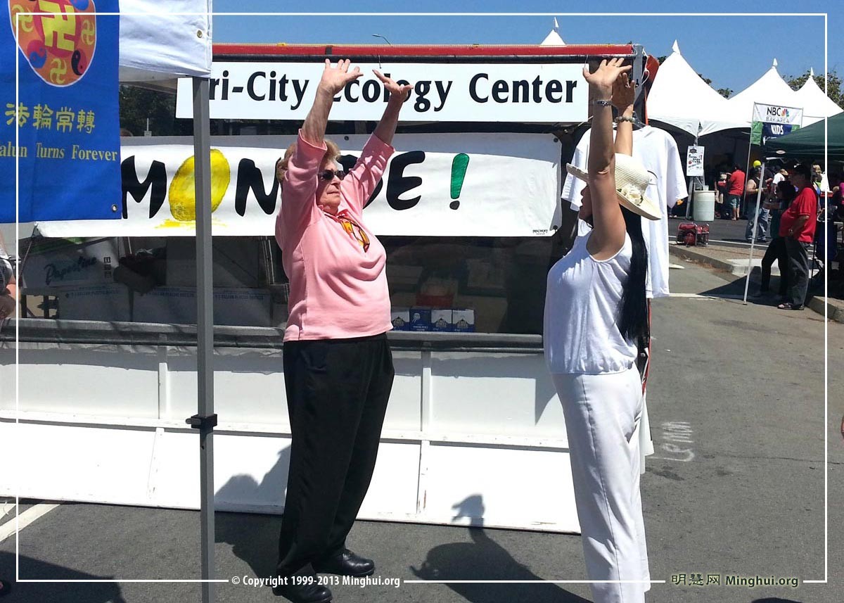 素食节组织者特别邀请法轮功学员参加活动,民众学炼功法