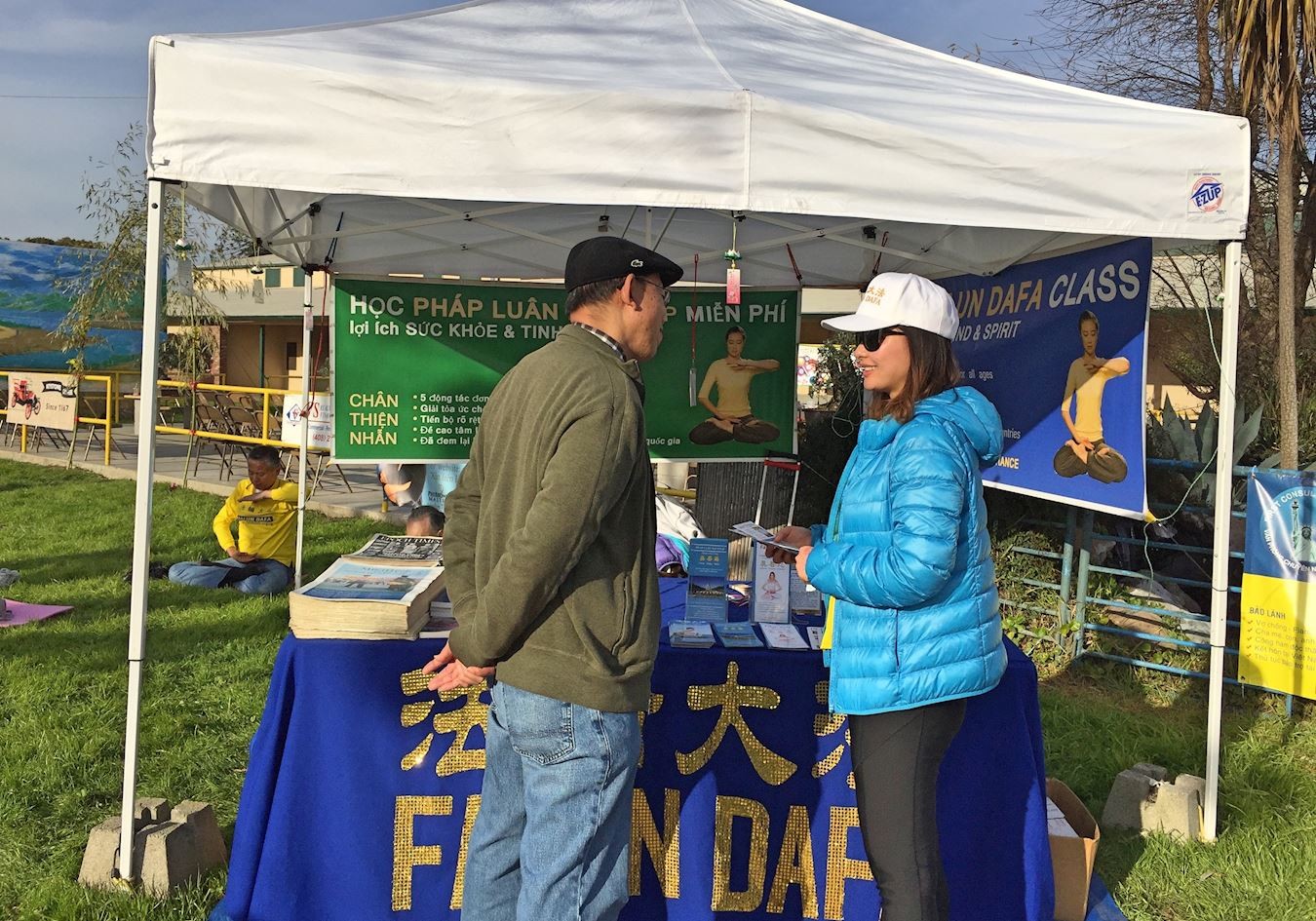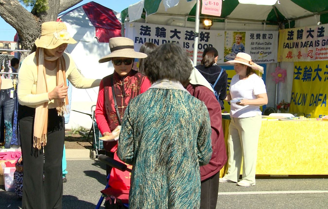 法轮功学员在加州博览会外弘法讲真相,有缘人在此听闻大法的美好