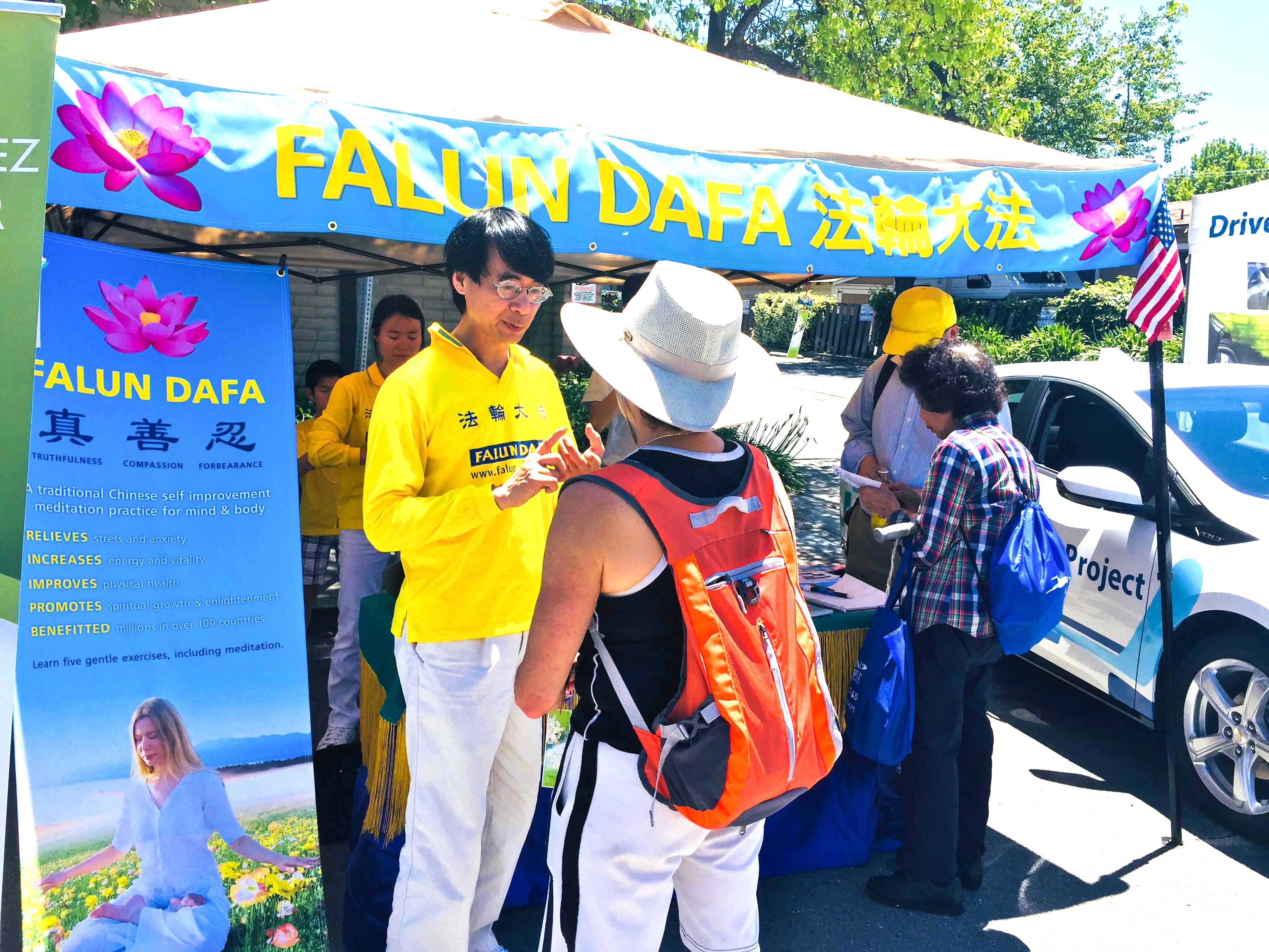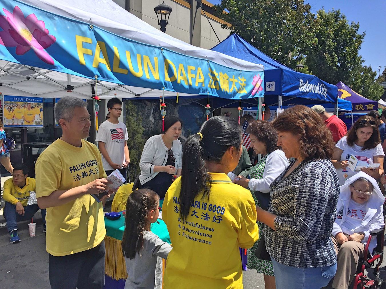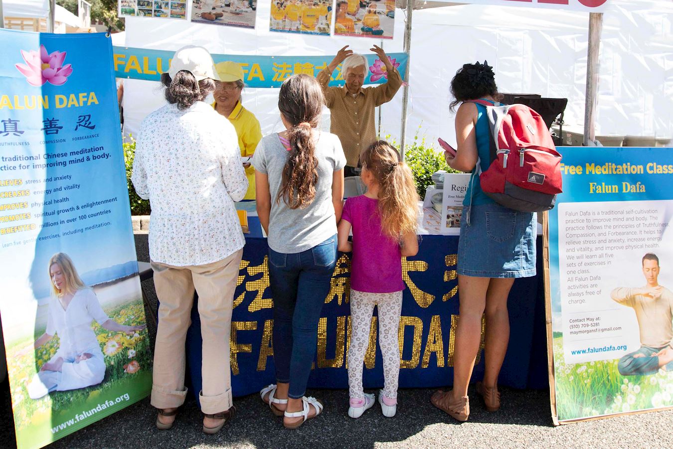 法轮功学员在帕洛阿图艺术节上设立展位,演示功法,讲述真相