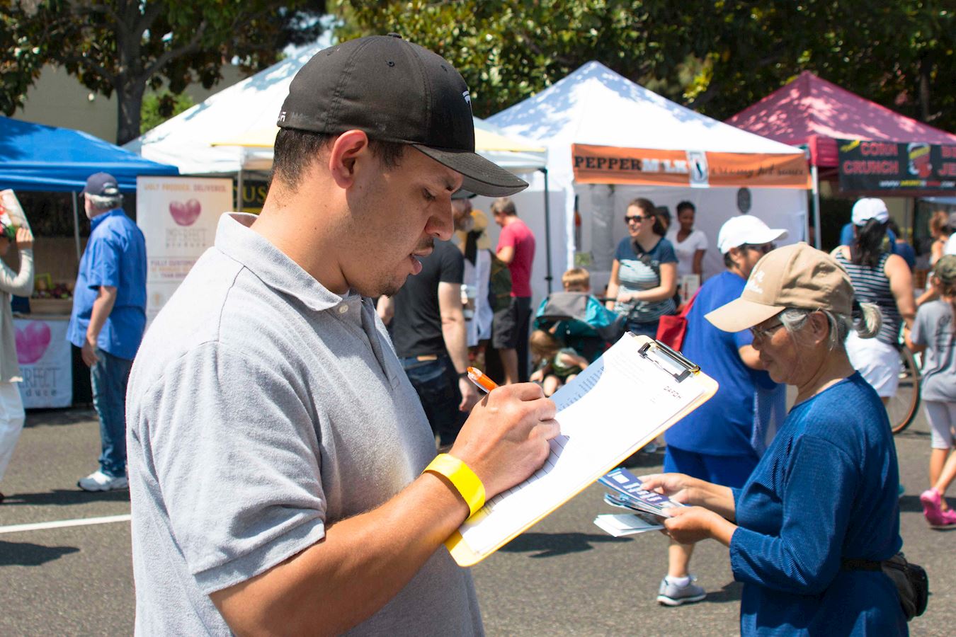 法轮功学员在加州首府西红柿节上,传播法轮功的真相。