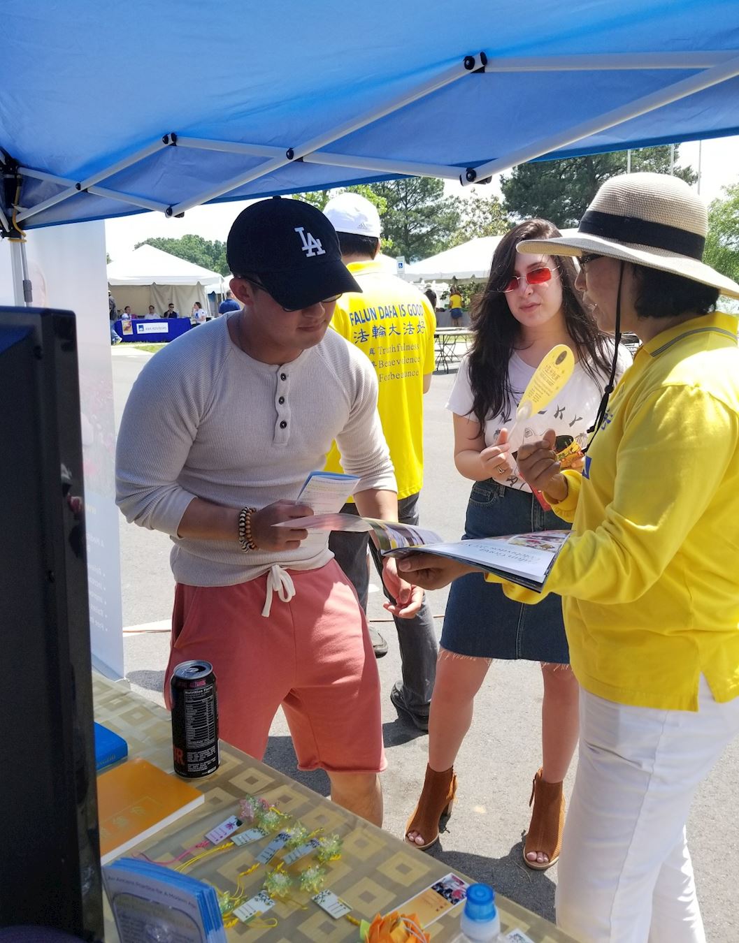 法轮功学员参加夏洛特亚洲节,向人们介绍功法,展位吸引了很多有缘人。