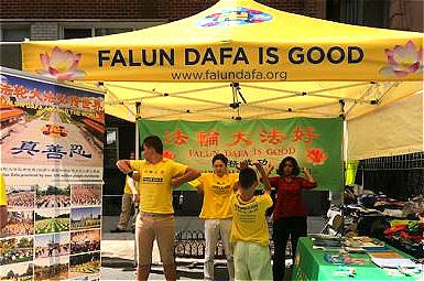 法轮功学员参加纽约街集市社区活动,带来独特的东方修炼文化。