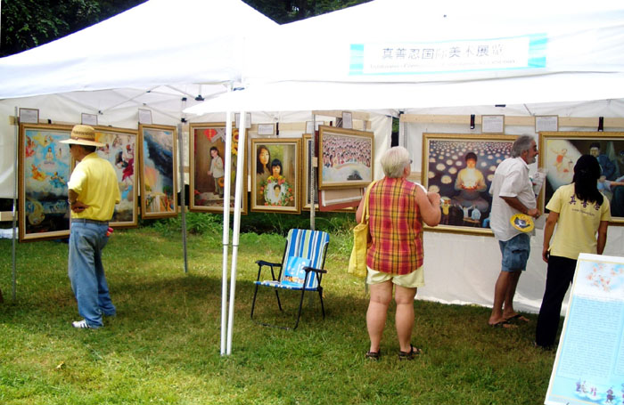 法轮功学员参加北卡依诺河节庆活动图为“真善忍美展”现场吸引许多民众了解真相.2007-7-8