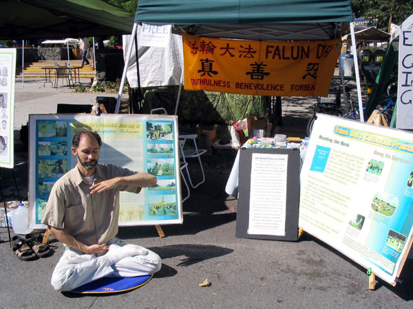 法轮功学员应邀参加俄勒冈尤金市庆典活动图为展位上演示祥和的功法2007-9-8至9