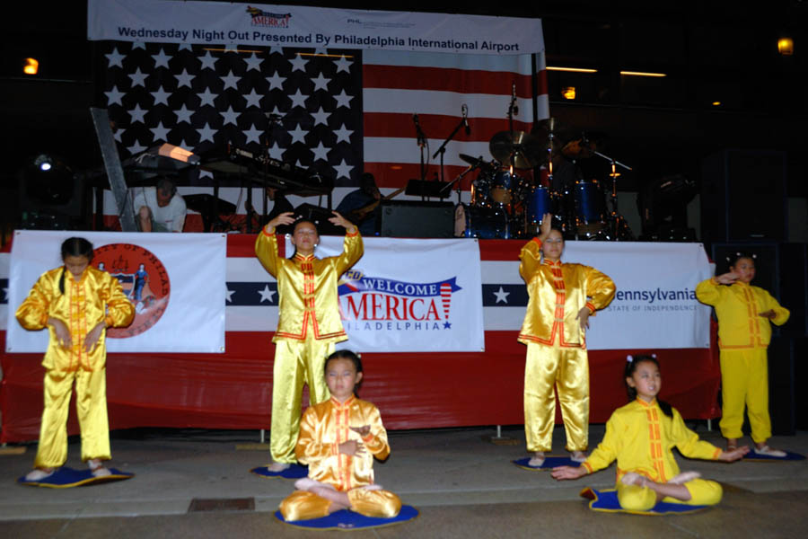 法轮功学员应邀参加费城美国独立日庆祝活动展现大法的美好图为优美舒缓的功法演示2008-7-3