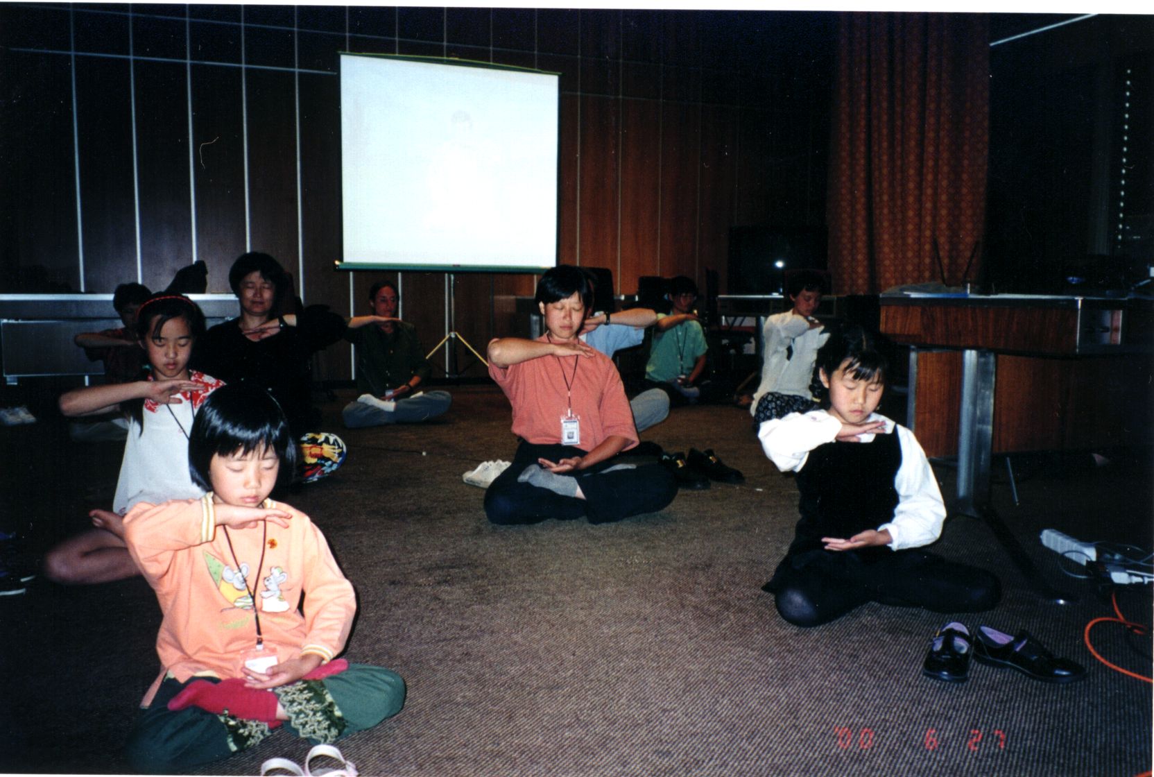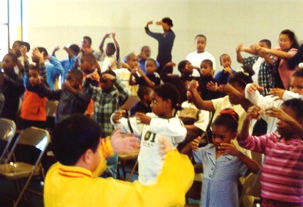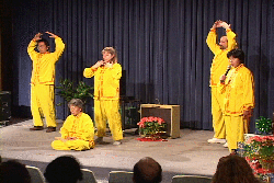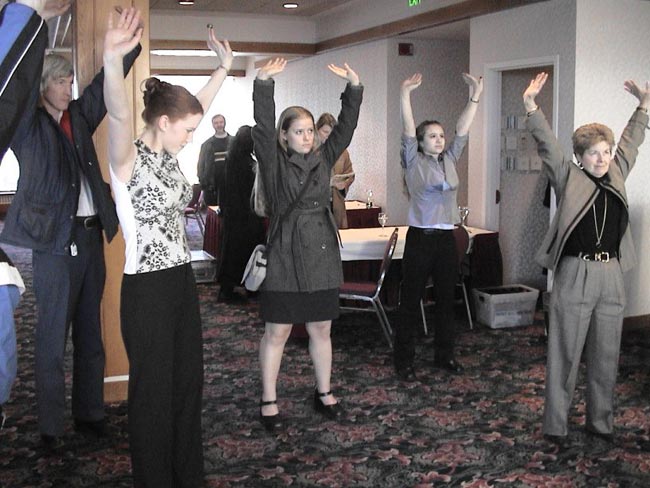 法轮功学员应邀在阿拉斯加世界事务理事会做专题报告--午餐会后,许多人士还留下来学习了法轮功的功法