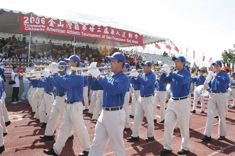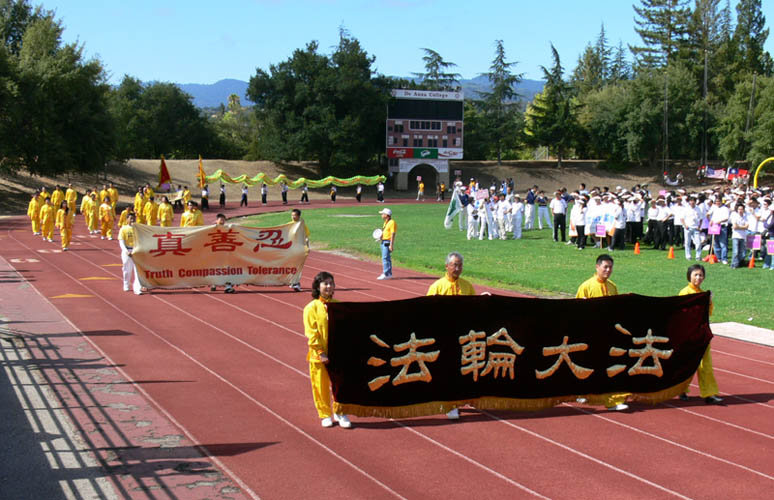 加州法轮功学员参加旧金山湾区华人运动会开幕式展丰采 图为队伍经过主席台2006-7-30