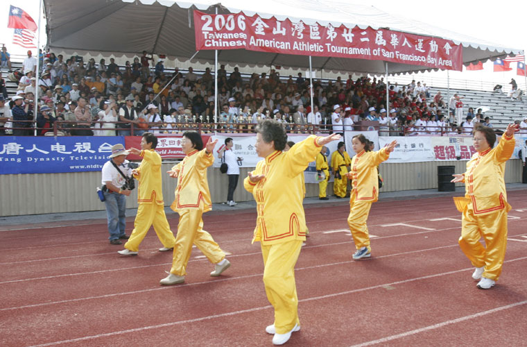 加州法轮功学员参加旧金山湾区华人运动会开幕式展丰采 图为展示法轮功功法2006-7-30