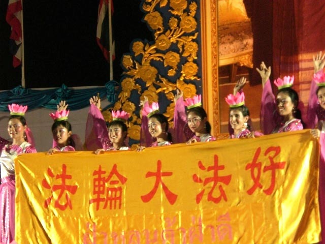 泰国法轮功学员参加皇后华诞庆祝活动获嘉奖,图为仙女队展示“法轮大法好”2006-8-12