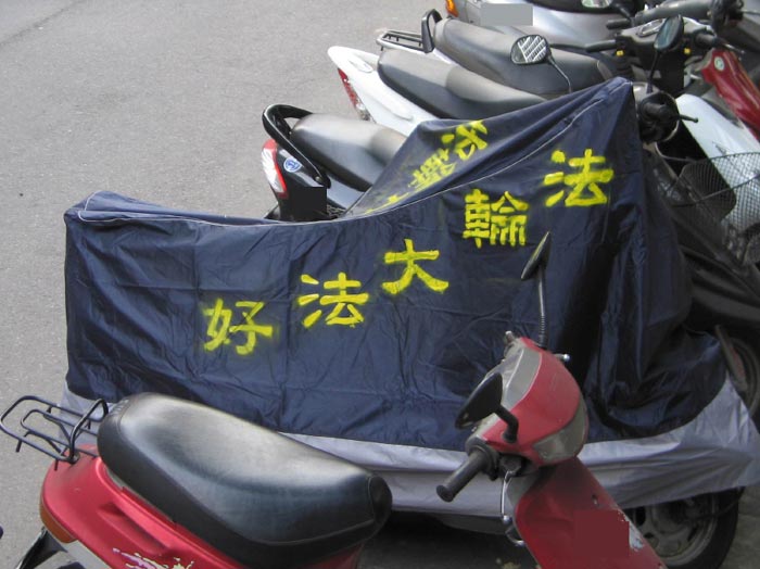 屏东法轮功学员在新任市代与里长就职典礼讲真相 图为学员拉起的横幅2006-8-1