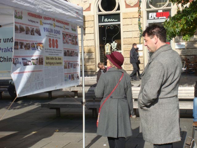 法轮功学员在慕尼黑中领馆前揭露恶党暴行图为路人签名谴责共产邪党的暴行2008-11-23